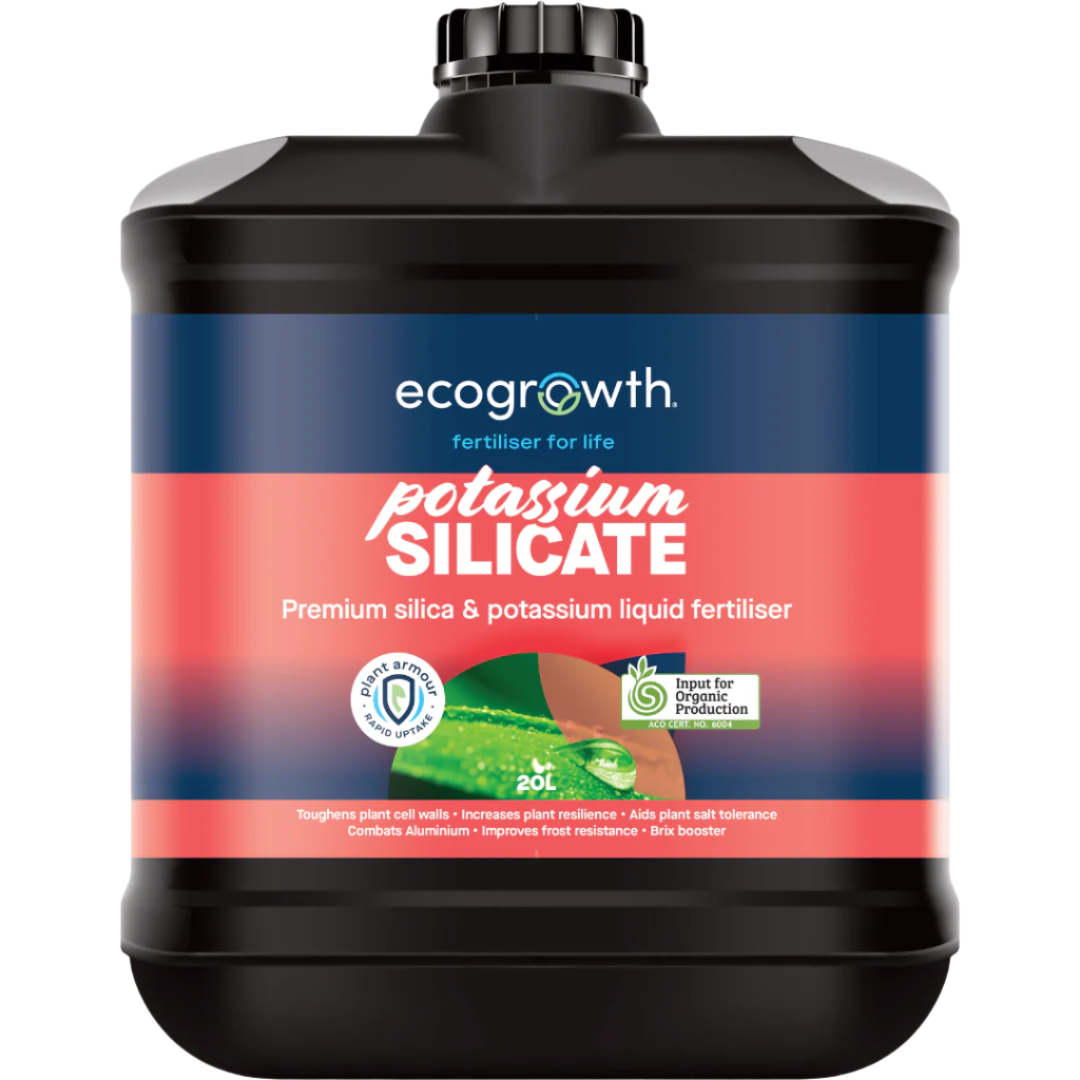 Strengthen your plants from the inside out with Eco Growth Potassium Silicate, a high-quality liquid formulation designed to improve plant cell wall structure, enhance stress tolerance, and protect against disease. Ideal for use across all crops, this essential supplement delivers a readily available source of potassium and silicon – two crucial elements for plant health and resilience.